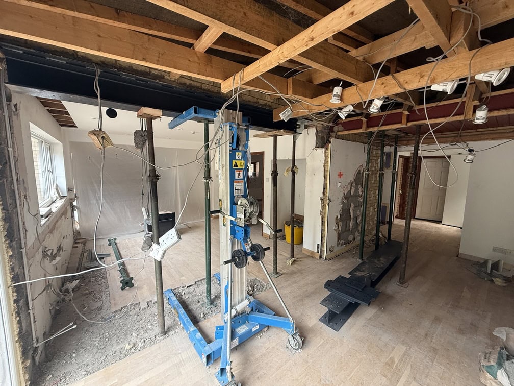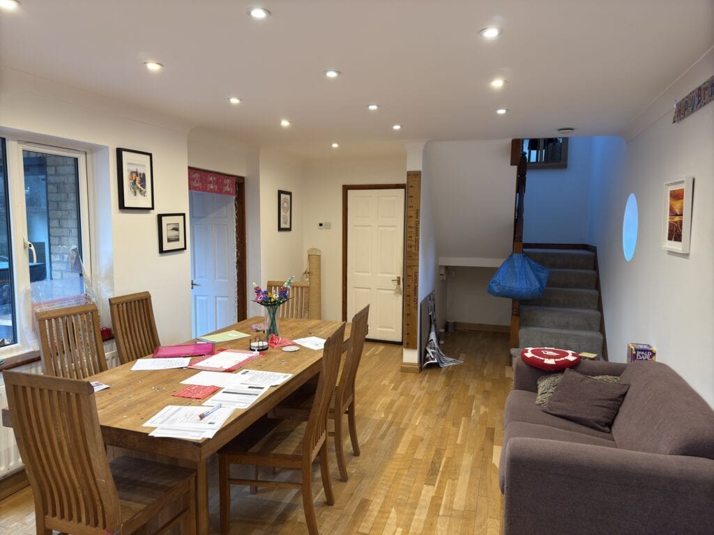 This project involved a full renovation and structural reconfiguration to completely open up the space. Working from CAD designs, we removed load-bearing walls and installed steelwork to create a new kitchen and utility layout, centred around a large island with quartz worktops. The existing kitchen was stripped out and replaced with a full-height window, bringing in more natural light. As part of the wider works, we installed Velux windows, new radiators and relocated key controls, managing all structural changes, waste removal and installation throughout.