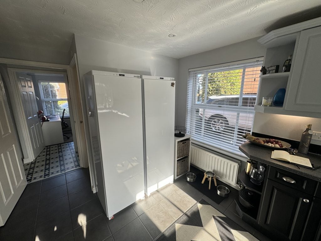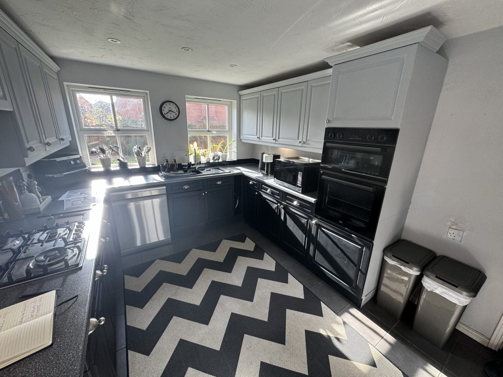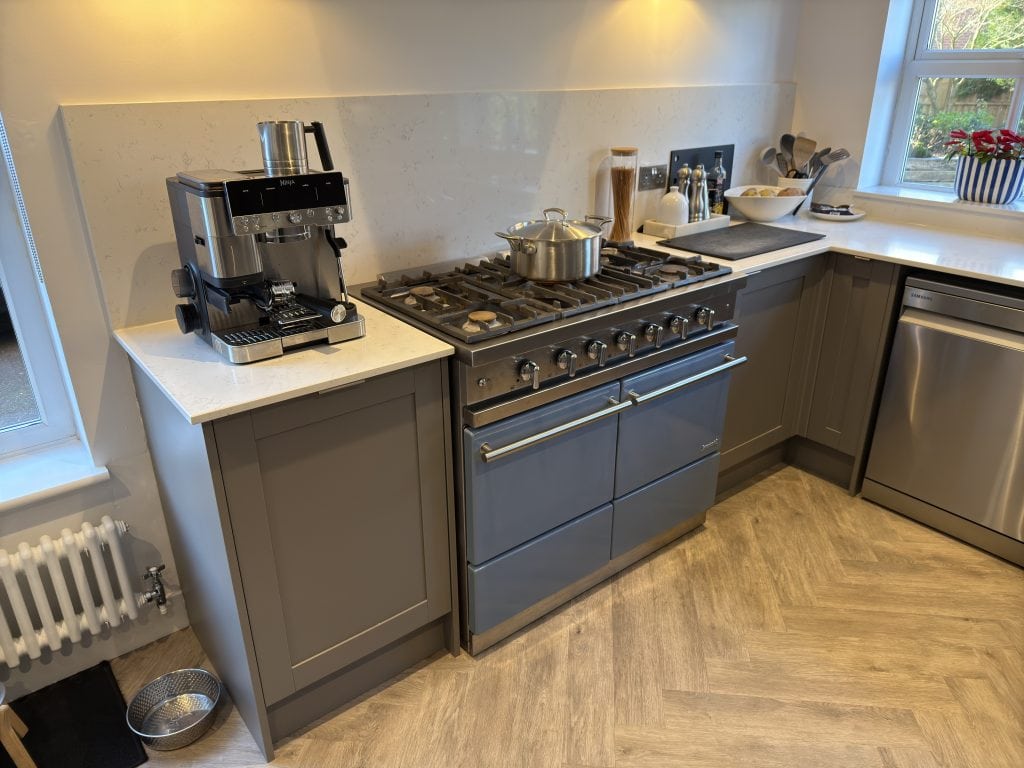 This full kitchen and utility renovation added a floating dresser and a ceiling suspended extractor, with new wall lights either side and a floor standing Rangemaster cooker. Glue down LVT flooring was fitted throughout for a durable, seamless finish, creating a practical yet stylish space for everyday living.